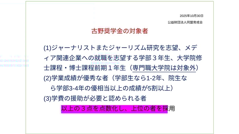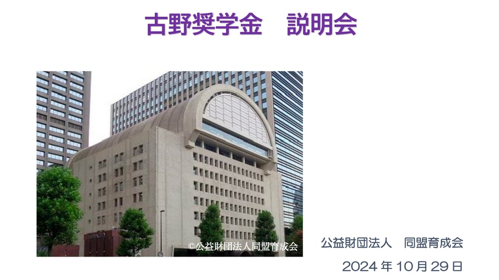 同盟育成会は 10 月 29 日、 2025 年度の古野奨学金奨学生募集について、大学事務局担当者を対象に、オンラインによる説明会を開いた。説明会には全国から 33 大学が参加した。...