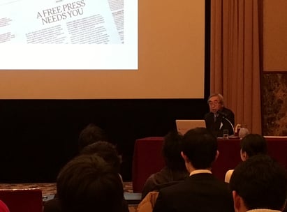 我孫子氏は、2016年の英国でのEU離脱に向けた国民投票、米大統領選挙において、離脱派の政治家やトランプ大統領が、事実を無視する発言を繰り返し、多数の支持を得ることに成功したと強調。こうした「ポストトゥルース」(真実軽視の時代)の中で、社会の分断化が進み、メディアへの不信が増大しているとも指摘した。