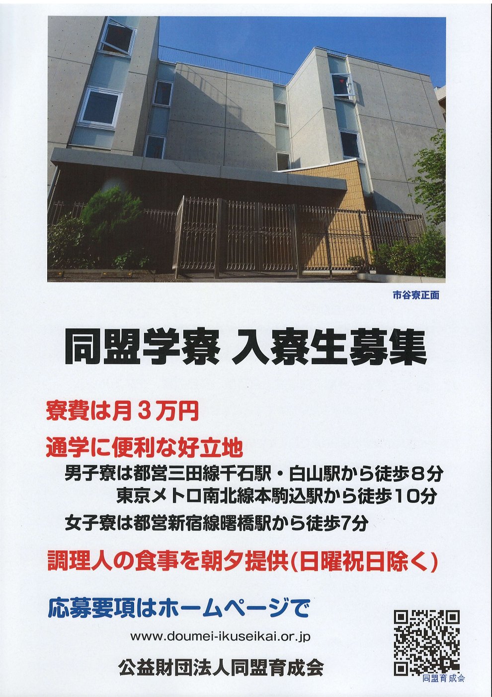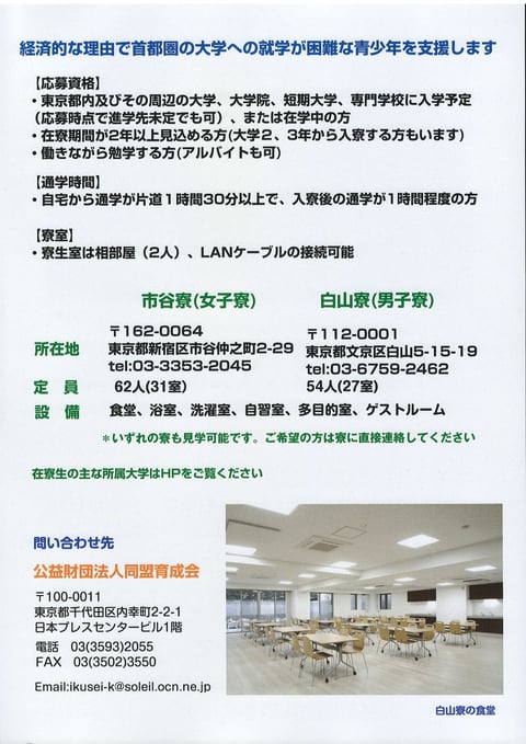 同盟育成会は、同盟学寮の募集案内(A4 版、表裏 2 ページ)を作成しました。